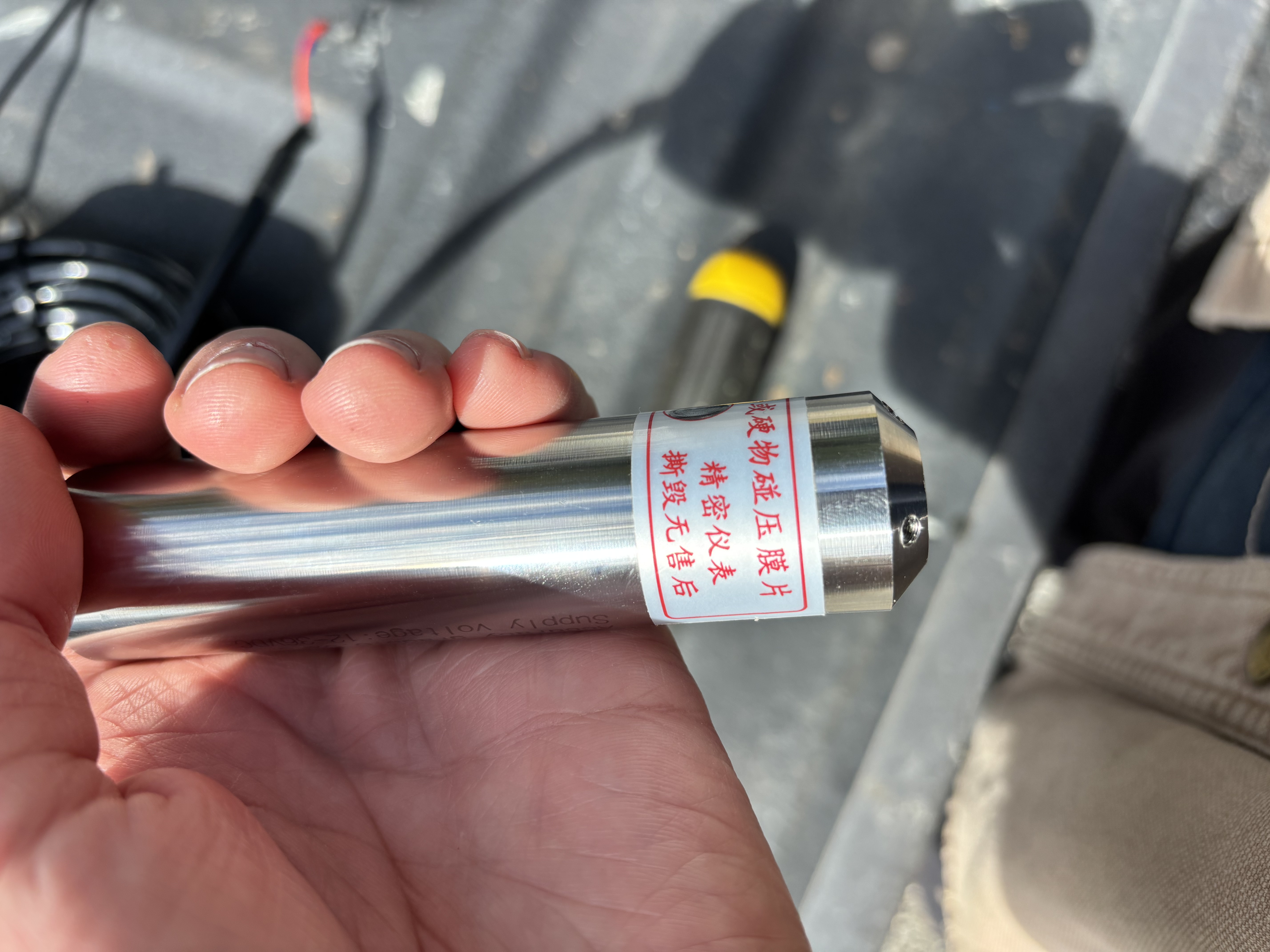 Lower the sensor through the tank hatch so it hangs vertically from its cable, a few inches above the floor. Resting on the bottom can block the diaphragm with sediment. Secure the cable at the hatch with a zip tie or cable clamp.