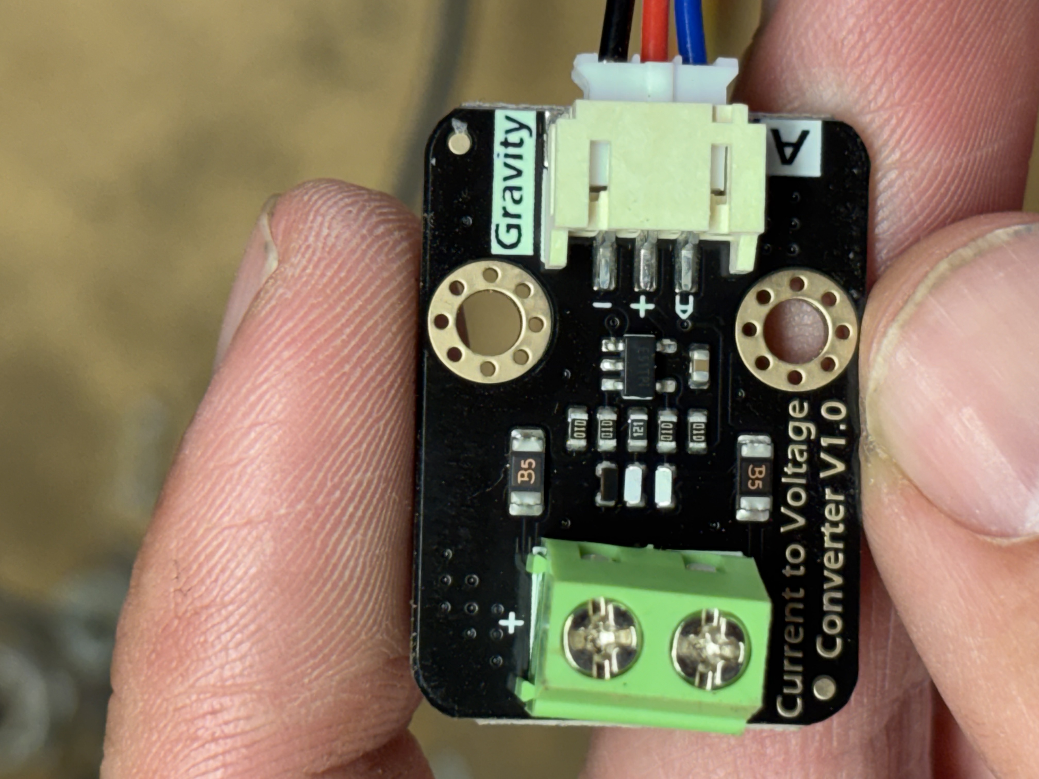 A note on output voltage: the SEN0262 V1.0 board has no voltage jumper. The output range is set by whatever you feed the VCC pin on the Gravity connector. Since we wire the red wire to ESP32 3V3, the signal output scales to the 0–3.3V range automatically. No configuration needed, but it does mean the ESP32’s 3.3V rail needs to be stable.