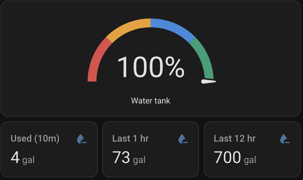 Restart Home Assistant after adding this. You’ll get entities like sensor.water_tank_level_monitor_tank_percentage, sensor.water_used_1h, and so on.