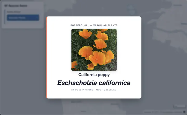 SF Biodiversity GameApr 1, 2026Go to Project Site Launch App Game screenshotFeatured Biodiversity INaturalist R Shiny
